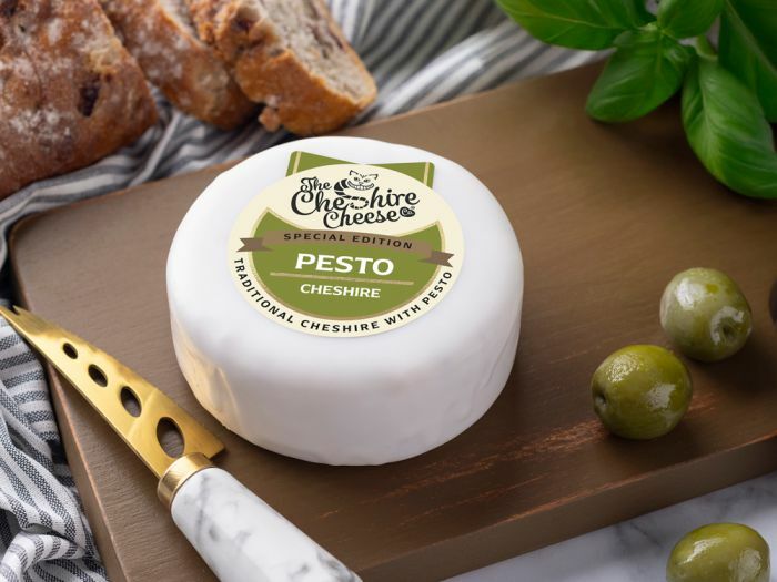 Cheshire Cheese Company´s flaggskepp - en traditionell cheddar som är känd för sin släta, krämiga konsistens nu som en ny sommarfavorit med smak av pesto. (Nötfri)