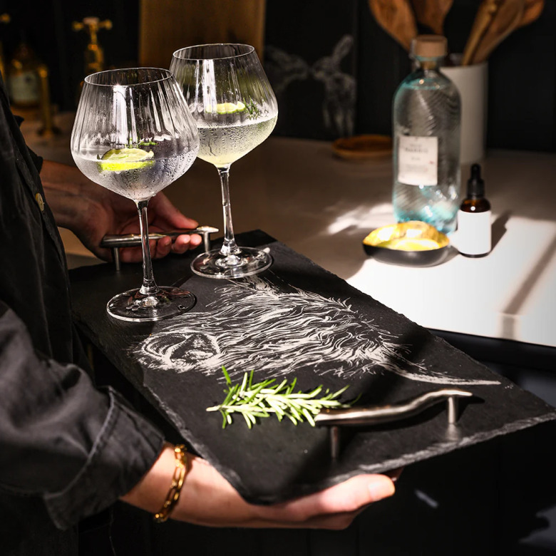 En stor serveringsbricka i skiffer med motiv av den klassiska höglandskon och eleganta handtag formade som horn. Kommer i en fin presentlåda!