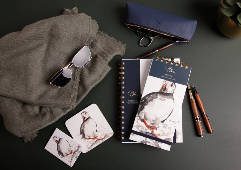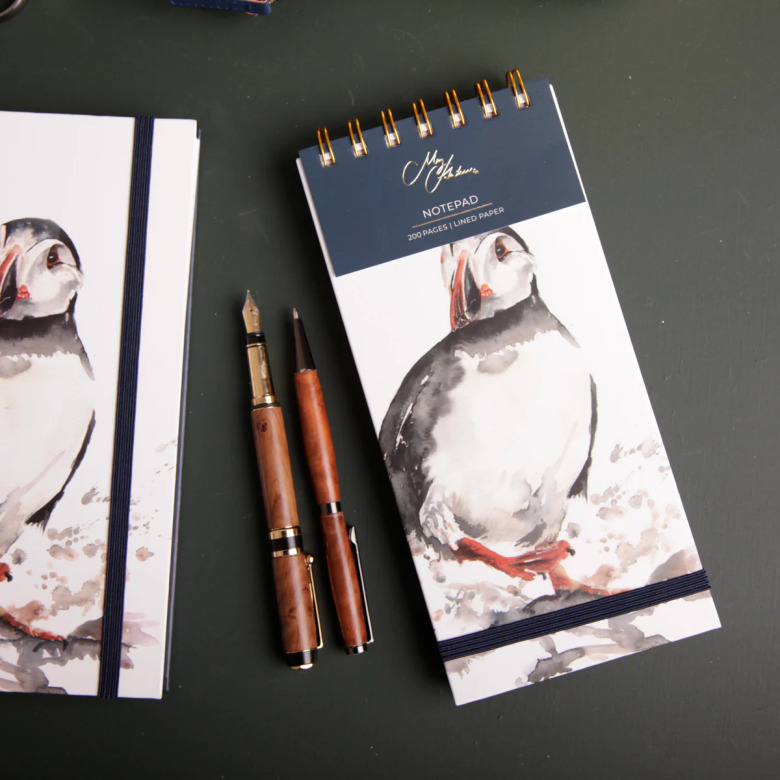 Ett lyxigt anteckningsblock med motiv av den brittiska akvarellkonstnären Meg Hawkins