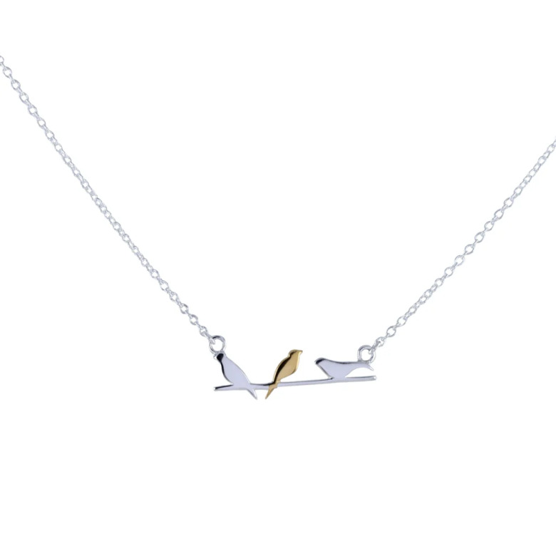 Tre små fåglar sitter dekorativt på rad - en av dem är pläterad i 18 karats guld som kontrasterar vackert till det högblanka silvret. Ett nätt och sofistikerat smycke som utstrålar elegans och sofistikering.