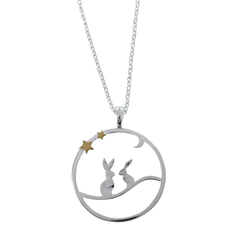 Upplev magiska månbelysta nätter med vårt Moonlit Hares-halsband. Det här smycket är otroligt charmigt, med två texturerade har-silhuetter som leker under den silvriga månen och de 18-karats guldpläterade stjärnorna. Enkelt i stilen, perfekt för vardagsbruk och garanterat något som kommer att beundras.