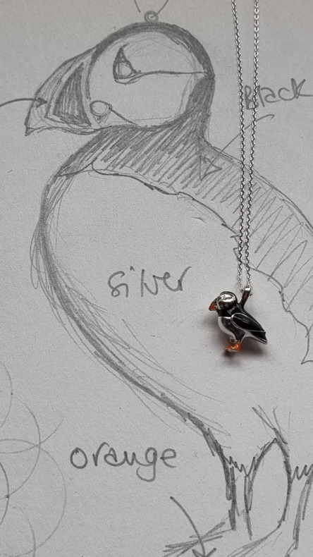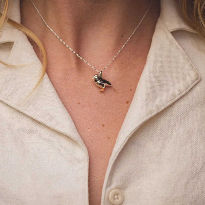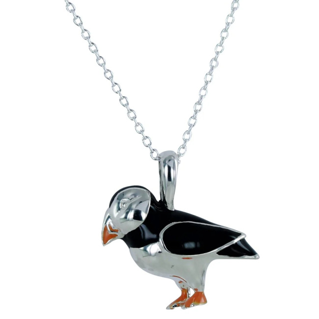 Ett charmigt halsband med ett litet hänge föreställande en lunnefågel - perfekt utformad och en härlig färgklick. Lunnefågeln är tillverkad i Sterling Silver med en vacker, högblank yta som fångar ljuset när du rör dig. De vackra detaljerna i svart och orange skapar en fin kontrast mot silvret och gör verkligen den här lilla figuren till ett riktigt blickfång!