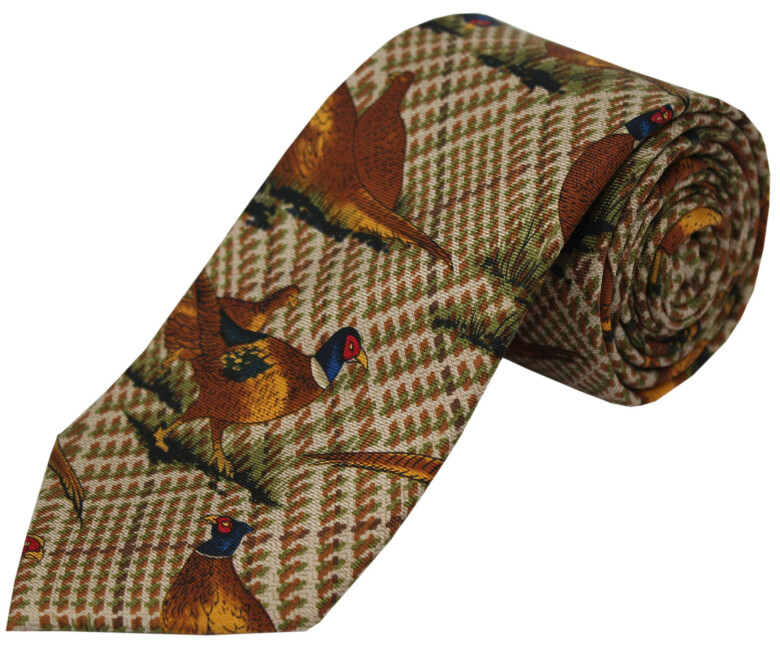 Slips i 100% silke, med motiv "Standing Pheasants on Tweed"