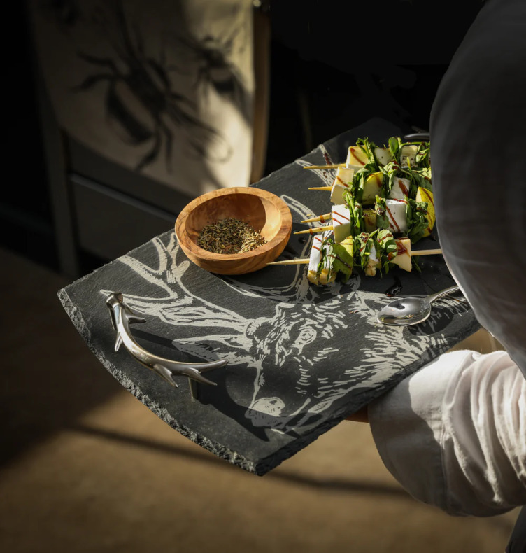 En mellanstor serveringsbricka i skiffer med motiv av en ståtlig hjort och eleganta handtag formade som horn. Kommer i en fin presentlåda!