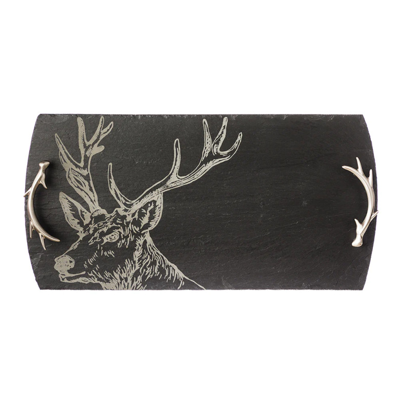 En stor serveringsbricka i skiffer med motiv av en ståtlig hjort och eleganta handtag formade som horn. Kommer i en fin presentlåda!