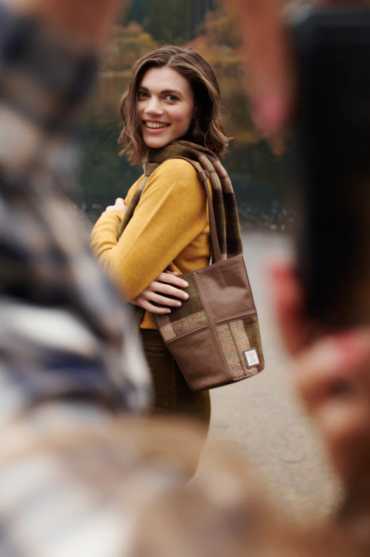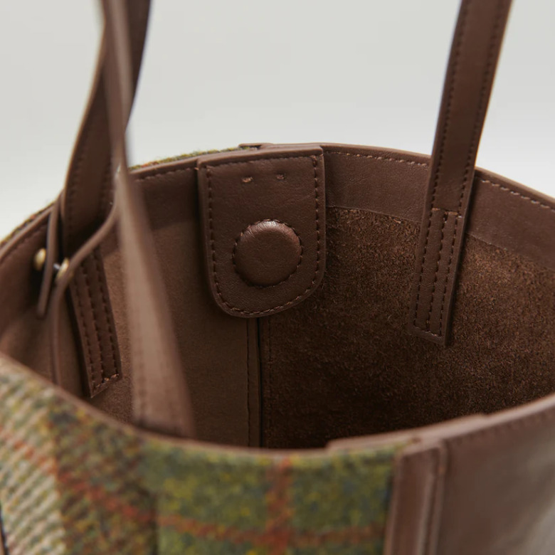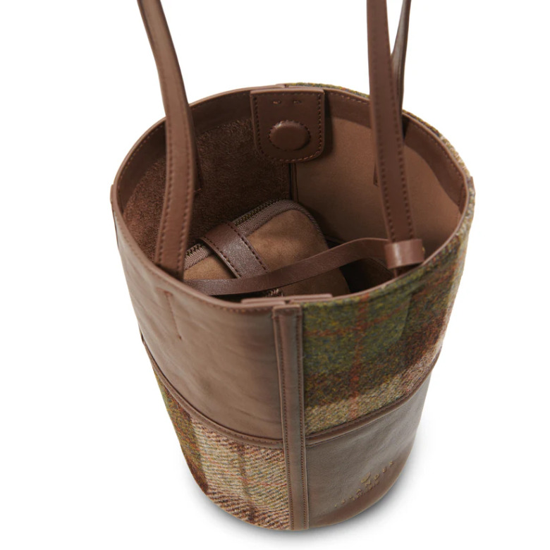 En stilren bucket-tote tillverkad av äkta Harris Tweed® och mjukt läder. Den smarta innerfickan håller din telefon och dina viktigaste saker ordentligt organiserade så du slipper rota i botten på väskan efter dina nycklar.