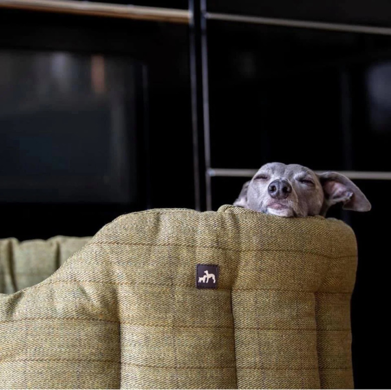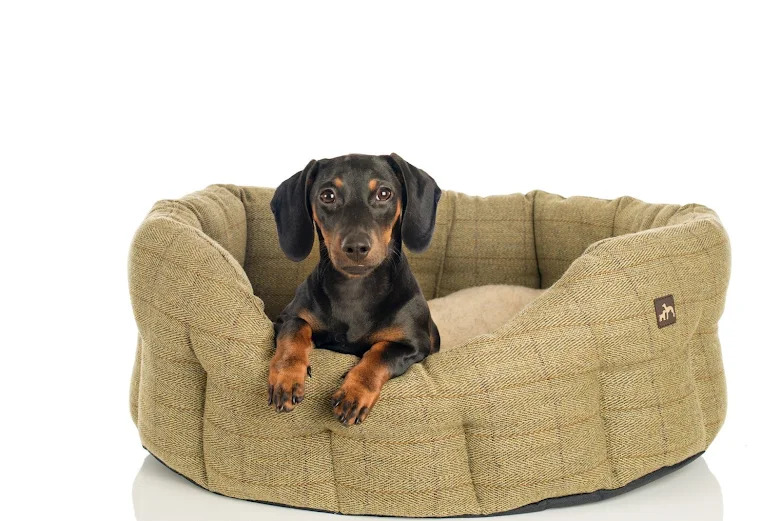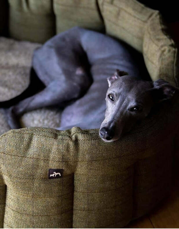 Tillverkad i tweed med innerkudde i mjukaste Sherpa.-fleece. Hela sängen är tvättbar i maskin!