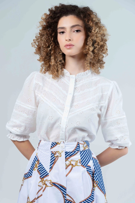 En söt blus från brittiska Hartwell Clothing. ISABELLA har en liten volangkrage, halvlånga ärmar & utsökta broderade detaljer som skapar en feminin look. Blusen är tillverkad av 100% kvalitetsbomull