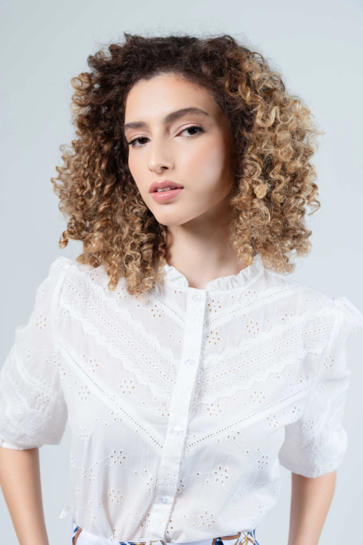 En söt blus från brittiska Hartwell Clothing. ISABELLA har en liten volangkrage, halvlånga ärmar & utsökta broderade detaljer som skapar en feminin look. Blusen är tillverkad av 100% kvalitetsbomull