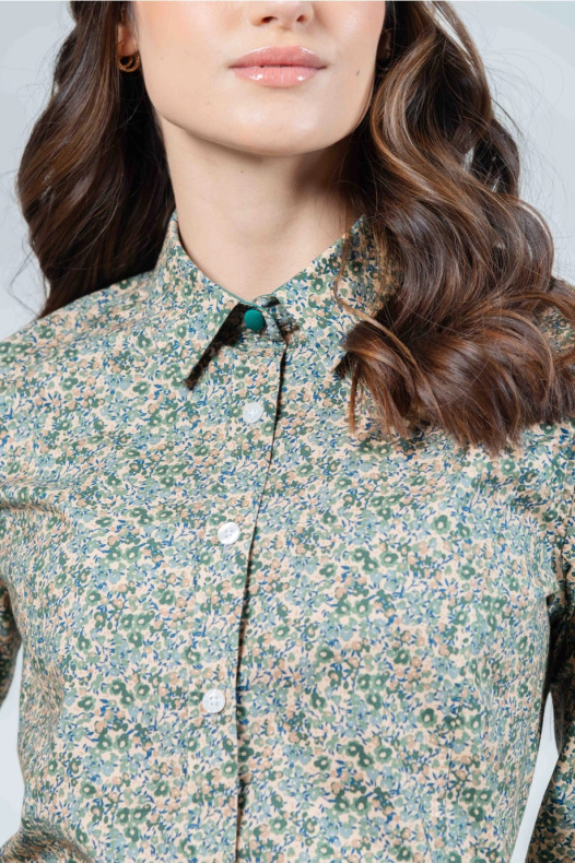 En feminin blus i ett vackert grönt blommönster från brittiska Hartwell Clothing. Tillvrkad i 100% bomullssatin och lycra.