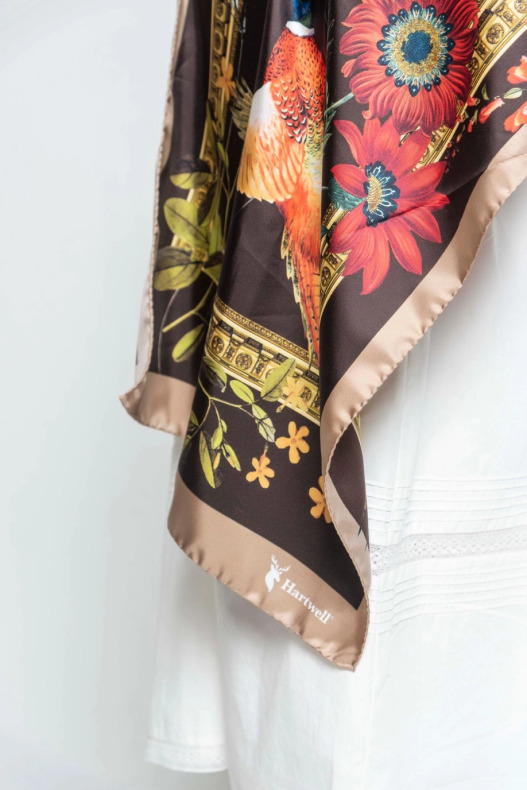 En underbar sidenscarf med vackra detaljer av klassiskt lantmotiv. Designad i England av Hartwell Clothing.