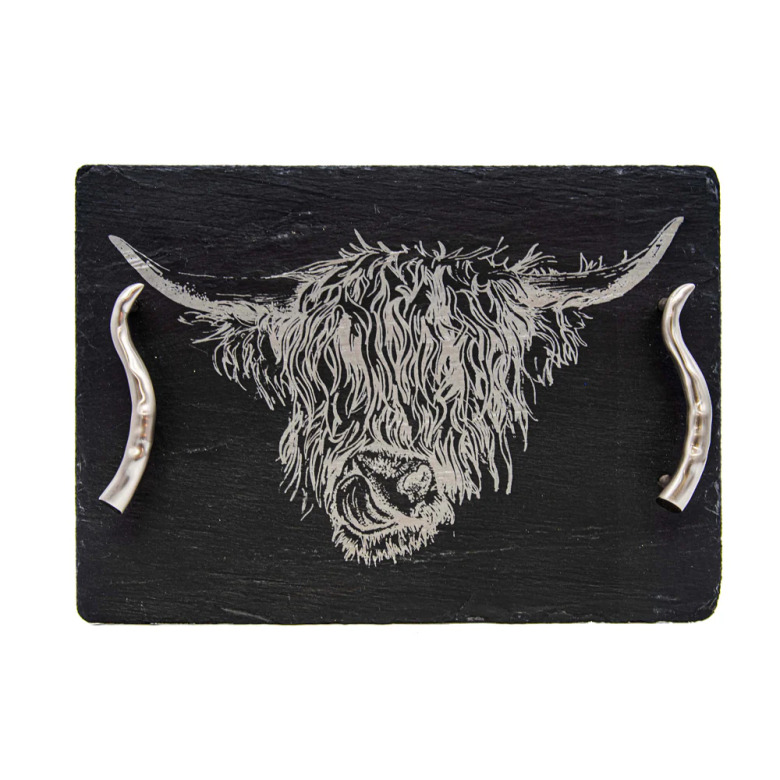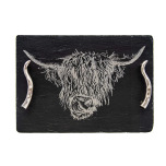 En mellanstor serveringsbricka i skiffer med motiv av den klassiska höglandskon och eleganta handtag formade som horn. Kommer i en fin presentlåda!