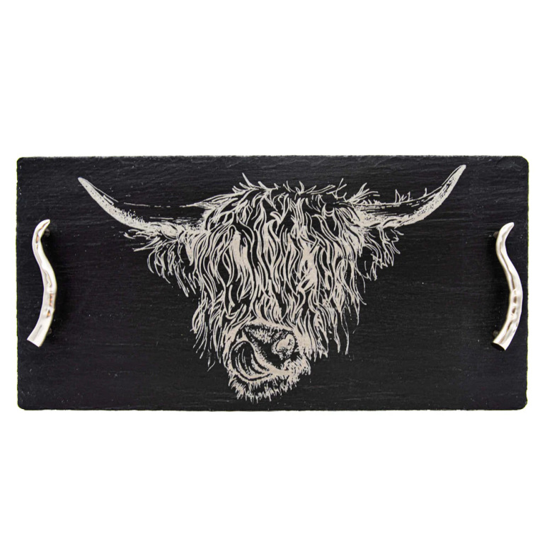En stor serveringsbricka i skiffer med motiv av den klassiska höglandskon och eleganta handtag formade som horn. Kommer i en fin presentlåda!