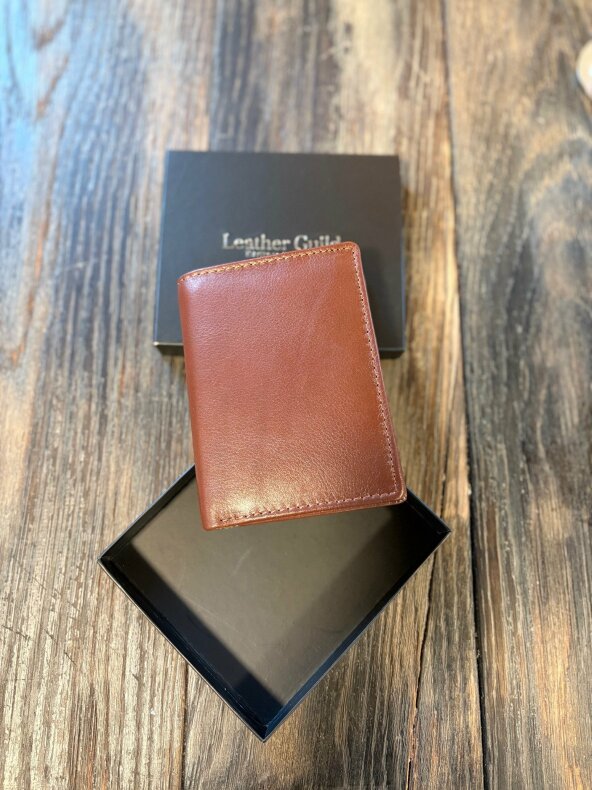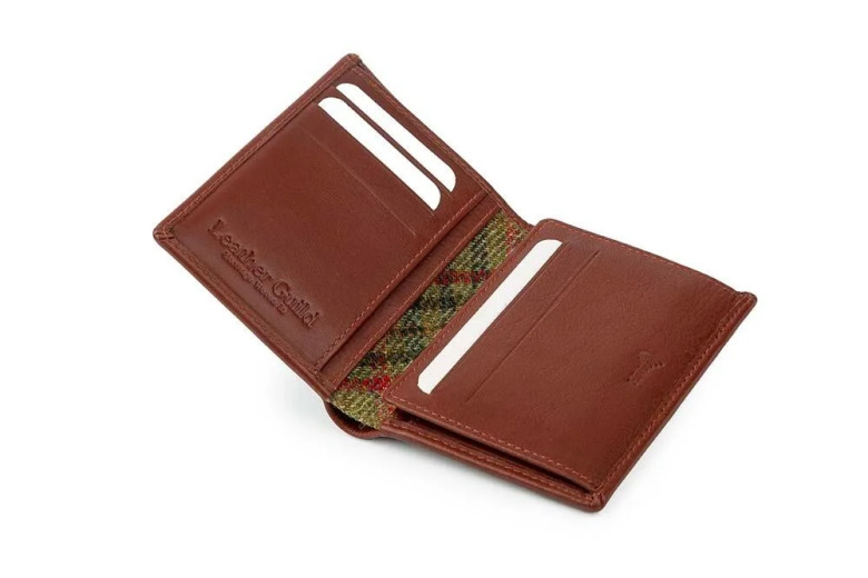 En kompakt tredelad plånbok med två nätfönster för t ex körkort & passerkort, 2 sedelfack, 7 kortplatser och två extra fickor. Tillverkad i premiumläder med tweed på insidan.