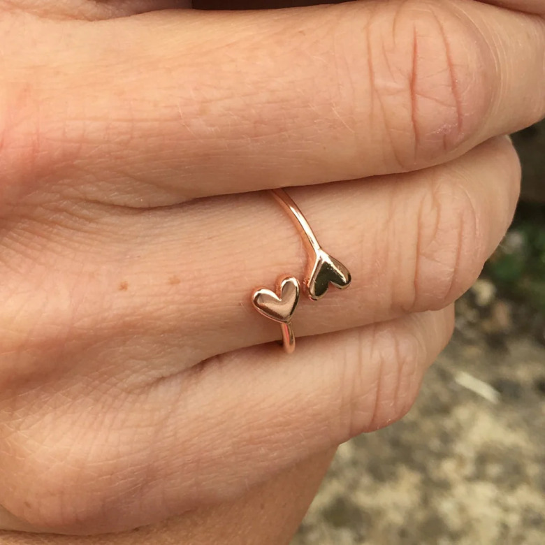 En vacker ring med en iögonfallande dubbelhjärtdetalj. Vi älskar hur de två hjärtana ligger sida vid sida – och du kan dessutom enkelt justera ringen för att passa perfekt.